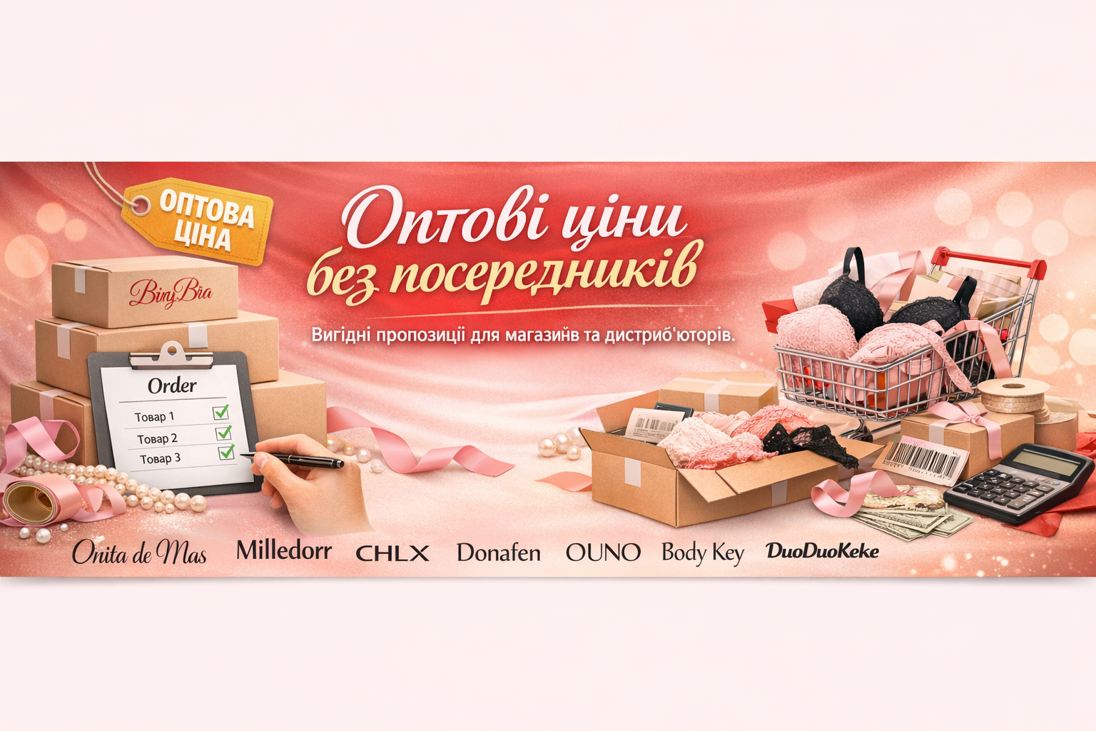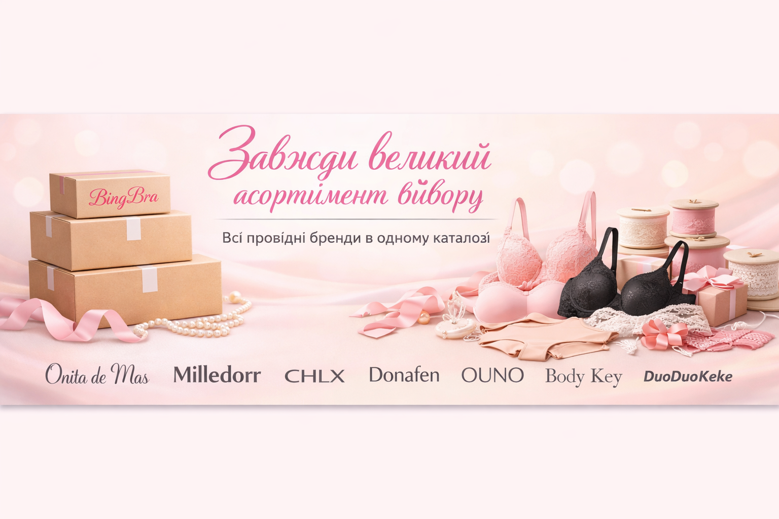 Вітаємо в BingBra — професійному оптовому онлайн-хабі, де якість зустрічається з вигідними інвестиціями. Ми спеціалізуємося на прямих поставках жіночої білизни від лідерів ринку, чиї імена стали синонімами комфорту та елегантності: Donafen, Onita de Mas, Duoduo Keke, Ouno, Milledor та CHLX.